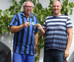 Am 27.5.25 fand die feierliche Übergabe des Wanderpokals, im Ehrenhof des Wettbüros in Stadeln statt. von links: Tippsieger Jörg Opitz Kassenwart Reiner Leugner